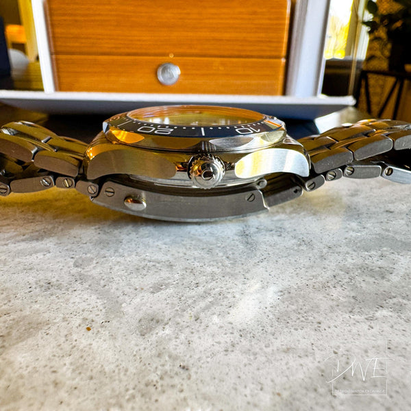 • Stainless steel bracelet with Omega’s patented extendable fold-over clasp and diver’s extension