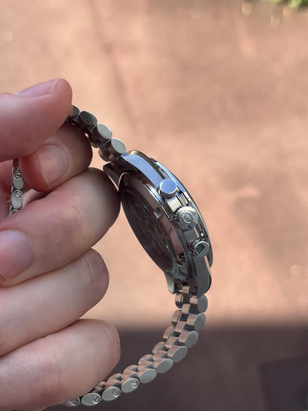 • Black aluminum tachymeter bezel for measuring speed and distance
