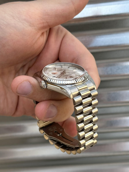 Step into understated luxury with this stealth-wealth Rolex Day-Date 36 in solid 18k white gold. This classic double quickset reference (18239) exudes sophistication with its fluted bezel and iconic presidential bracelet, offering a timeless blend of elegance and functionality.