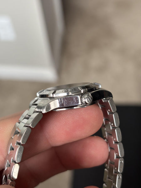 For sale is the elegant and reliable TAG Heuer Aquaracer 300M Quartz, reference WAF1414. This 27mm timepiece combines a compact, feminine design with the robust performance expected from the Aquaracer series, making it perfect for both everyday wear and water sports.